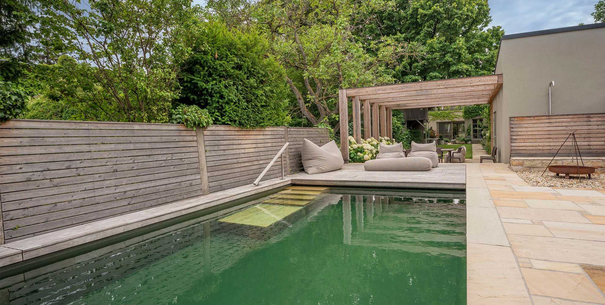 Badevergnügen in weichem, natürlich gereinigtem, klarem Wasser bietet der Naturpool. Das Schwimmen steht im Vordergrund. Schnellfilter entnehmen dem Wasser die Nährstoffe.